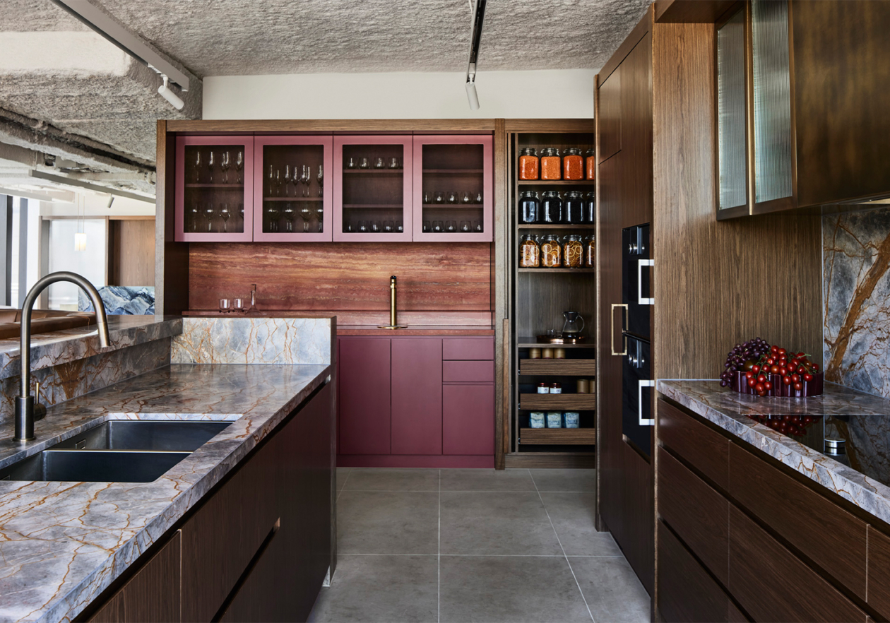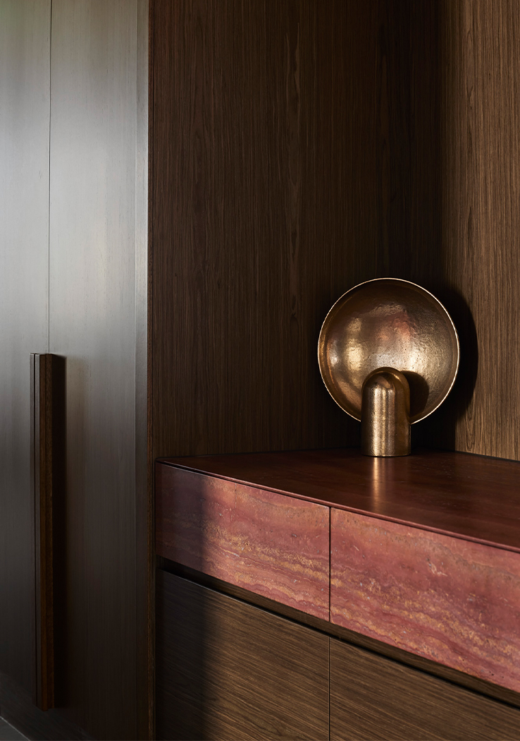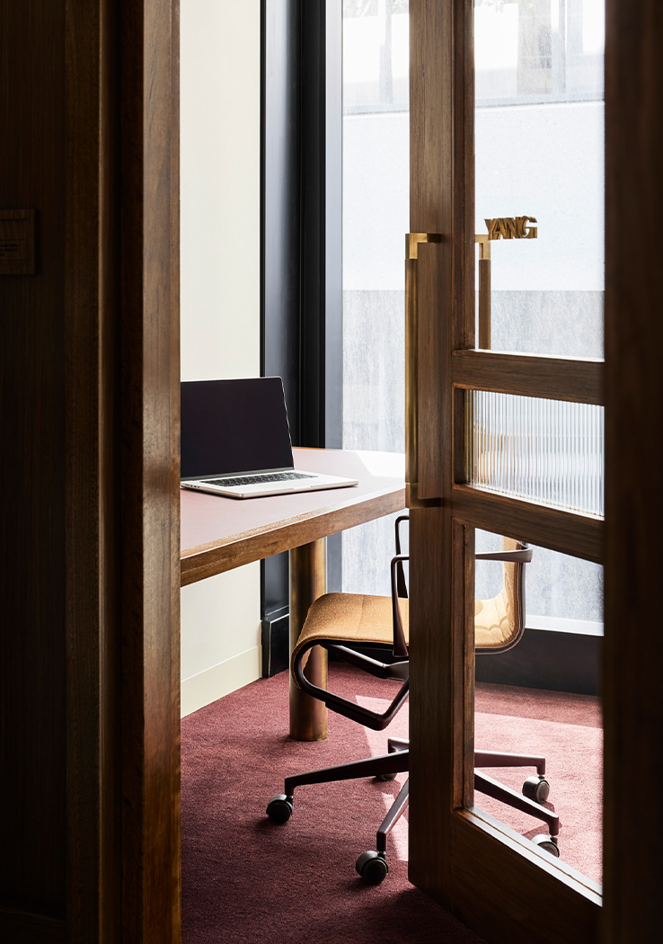 On arrival, their hospitable identity is reflected by a welcoming lounge, rich in colour and texture. A bespoke two-sided sofa accommodates small groups and individuals, bordered by a luxurious kitchen that blurs the boundaries between client and visitor domains. High quality appliances, a large pantry, glass-fronted cabinets, and a striking bar lined with striated red travertine allow their to comfortably host and entertain guests, elevated by café-style booth seats and lush hanging planters. The unusual positioning of the kitchen and breakout space unlocked the floor plate, eliminating unnecessary circulation and allowing us to accommodate their functional needs within a relatively compact floor plate.