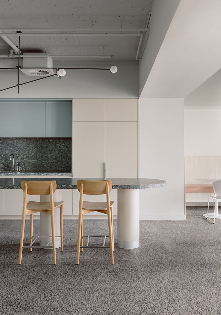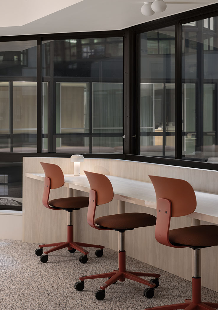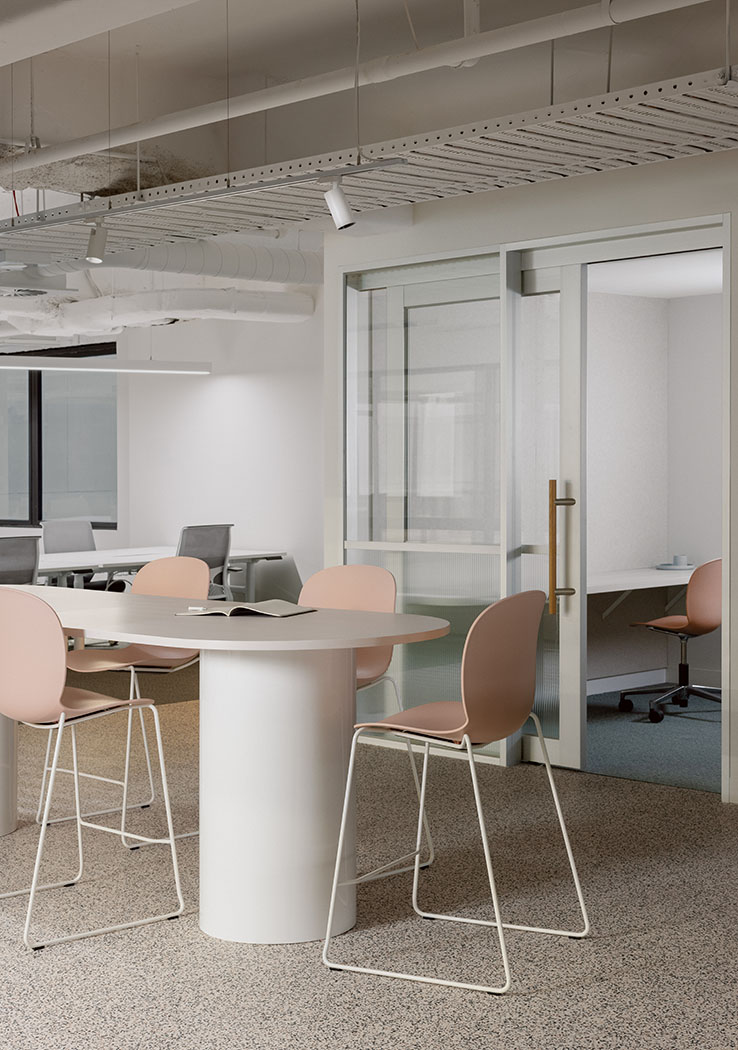 Honoring the heritage of the base building, the design delivers a contemporary and forward-thinking workplace environment. The Cornerstone International Solutions team reconfigured the floor plan, focusing on the unique central atrium. The curation of a soft finishes’ palette, considered lighting and diverse working spaces, successfully elevates the experience for the staff and guests.