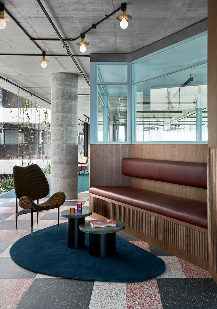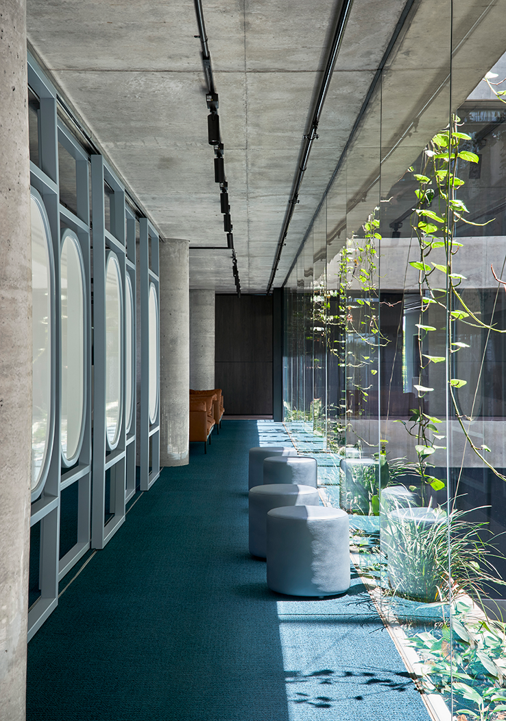 The entrance features a stainless steel reception desk with a teal finish, establishing a sci-fi-inspired ambience. Views of the atrium with foliage-draped concrete enhance the atmosphere, while strategically placed walnut timber-lined banquettes in burgundy leather address the need for an approachable space.