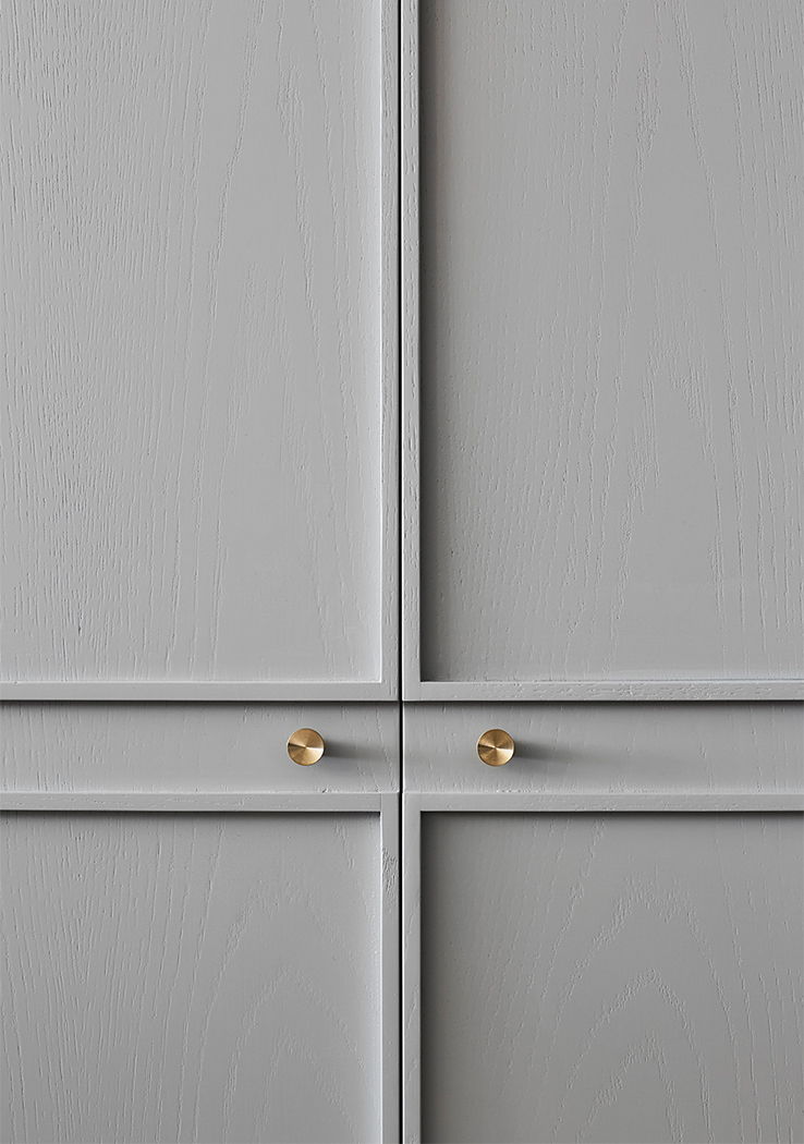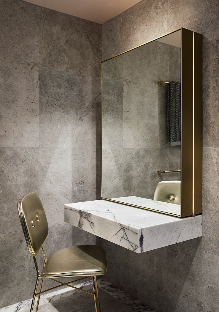 Details reflect the delicate shades and textures of a felt-lined treasure trove, from the soft grey and pink wallpaper lining the walk-in robe to the cocoon-like bathroom with its delicate pink painted ceiling, accented with black-veined pink marble.