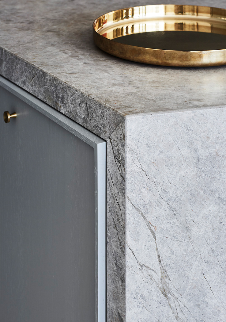 A bevelled, diamond-shape island bench in the kitchen in grey marble gives it a gem-like form, while appliance cupboards have grey two pack timber finish, and the drawers, shelves and cupboards are lined in navy and pink accent colours.