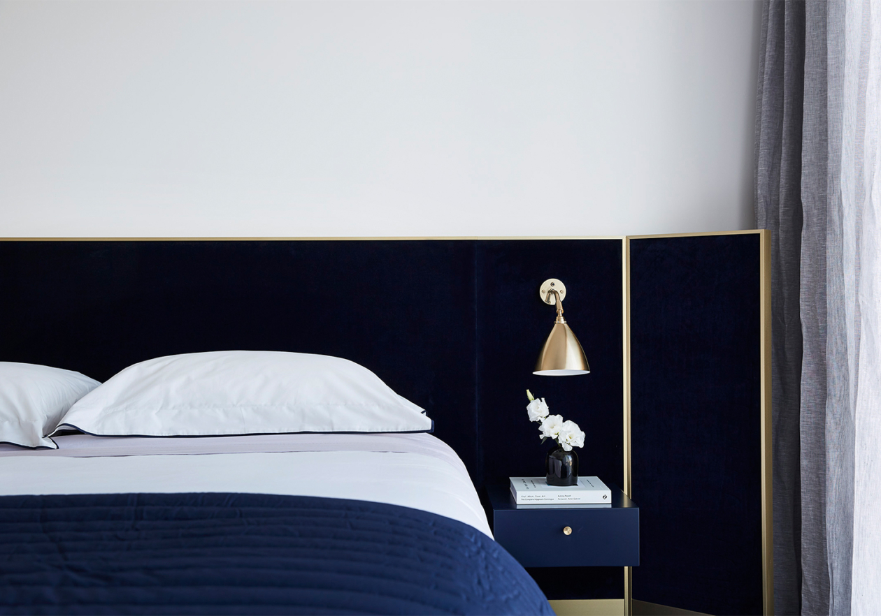 The colour palette has been built around the judicious application of striking, bold tones: navy blue carpets, doors and skirting provide warmth and drama without constraining the volumes.