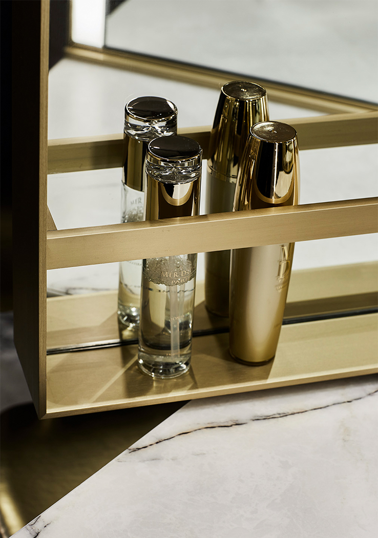 Inspired by the idea of a jewelry box, Cornerstone International Solutions created a compact and fabulous space filled with notable elements and hidden surprises concealed within the apartment’s surfaces.
